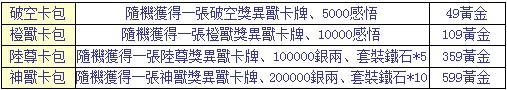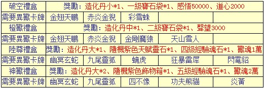 神獸卡包:隨機獲得一張神獸獎異獸卡牌、200000銀兩、套裝鐵石*10