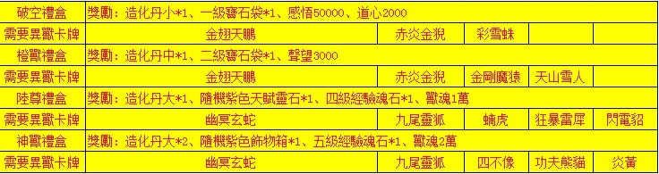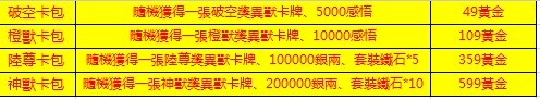 神獸卡包:隨機獲得一張神獸獎異獸卡牌、200000銀兩、套裝鐵石*10