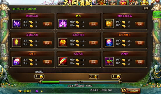 活動說明:此次更新後將開放限時活動‘天闕寶閣’,玩家可在寶閣中購買超優惠道具,購買越多折扣越多。