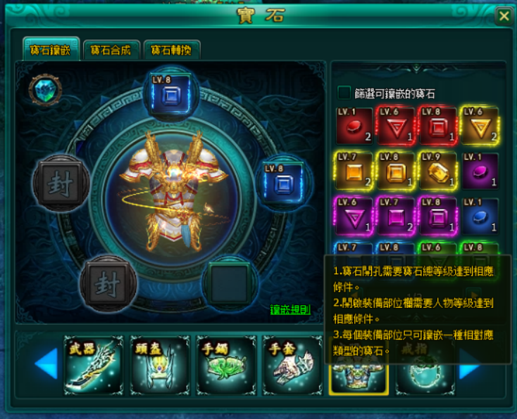 寶石鑲嵌:將寶石鑲嵌在裝備部位上,給角色帶來大量屬性加成,每件裝備部位可鑲嵌5顆寶石