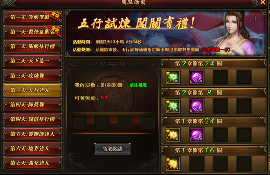活動規則:截至開服第3天24:00,通關五行試煉指定關卡,即可領取五行石。