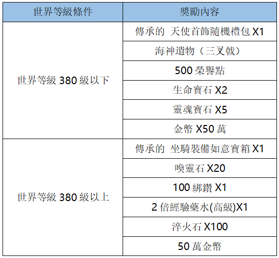 世界等級380以下的服燃放耀世爆竹概率開出:耀世大獎如意寶箱(可選:玄天冰魔召喚石/色欲魔魂),神鷹火種,洛克之羽,魔戒元靈等珍稀道具;