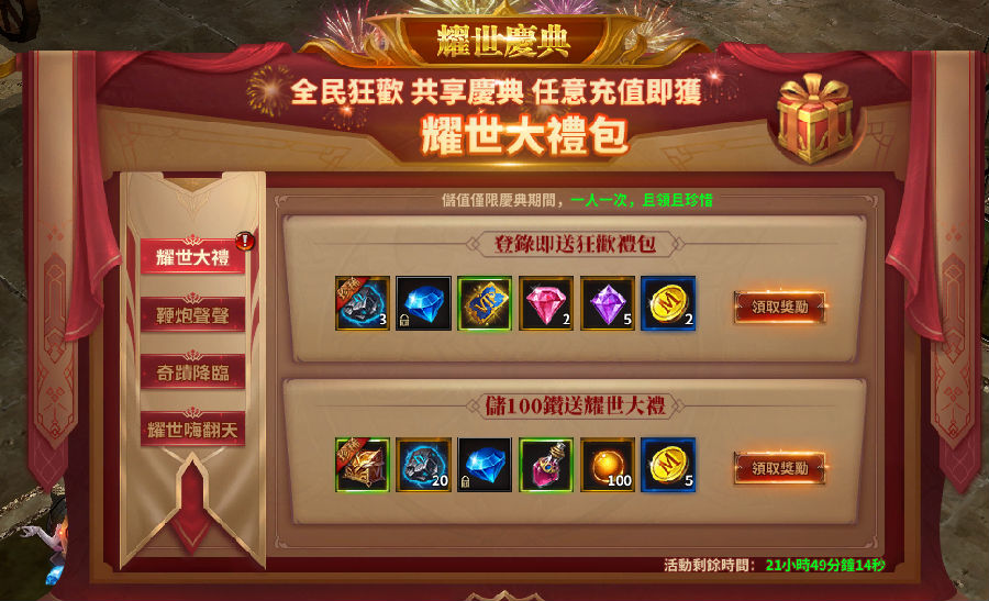 (2)活動期間,充值100鑽,即可獲得耀世大禮!活動結束後,若有待領取的耀世大禮,將會以郵件形式發放;