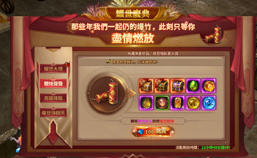 (1)耀世慶典當天,可以花費100鑽購買爆竹達人稱號,購買即可獲贈耀世爆竹;