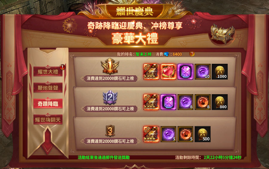 (2)活動結束時,將根據排行榜即時數據,為本服消費排行榜中排名前三的玩家發放奇跡降臨大獎,獎勵將在活動結束後通過郵件進行發送。