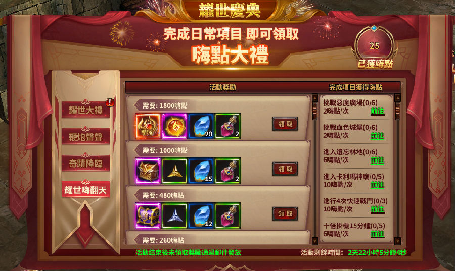 (1)在慶典當天完成日常專案,即可獲得嗨點,當獲得嗨點達到對應檔位配置數量時即可領取嗨點獎勵;