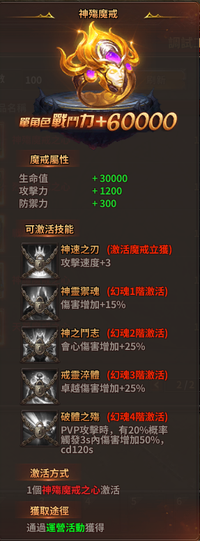 大獎展示:神殤魔戒之心,可用於啟動暝耀魔戒,單角色戰鬥力增加60000!